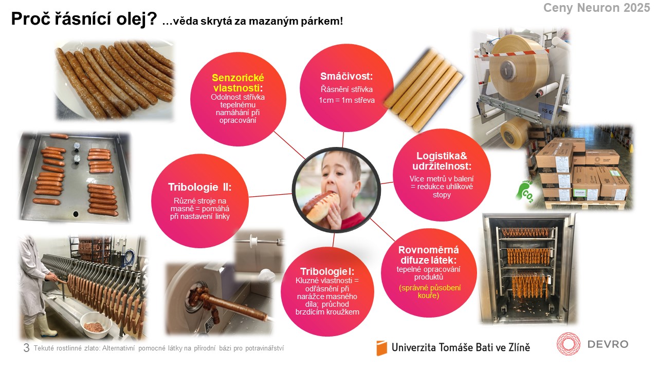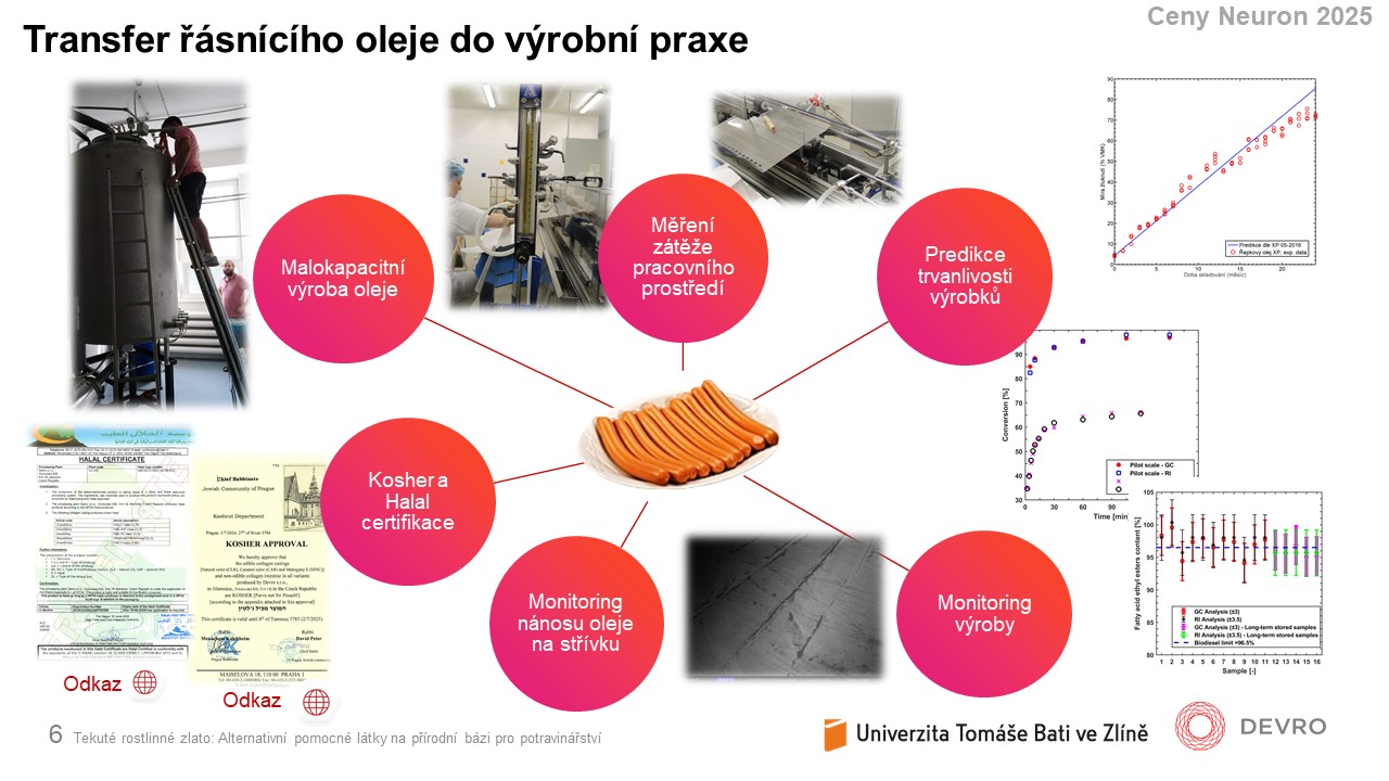 Projekt představuje úspěšný příklad efektivního transferu univerzitního výzkumu do praxe. Společnost Devro s.r.o., globální výrobce jedlých kolagenních střívek, dlouhodobě hledala alternativu k řásnicím olejům využívaným při klíčové výrobní operaci řásnění. Tyto oleje zásadně ovlivňují vlastnosti výrobku při jeho aplikaci v masné výrobě. S postupně se zpřísňujícími regulacemi na důležitých evropských trzích hrozila společnosti nejen ztráta tržního podílu, ale také významné ekonomické dopady.