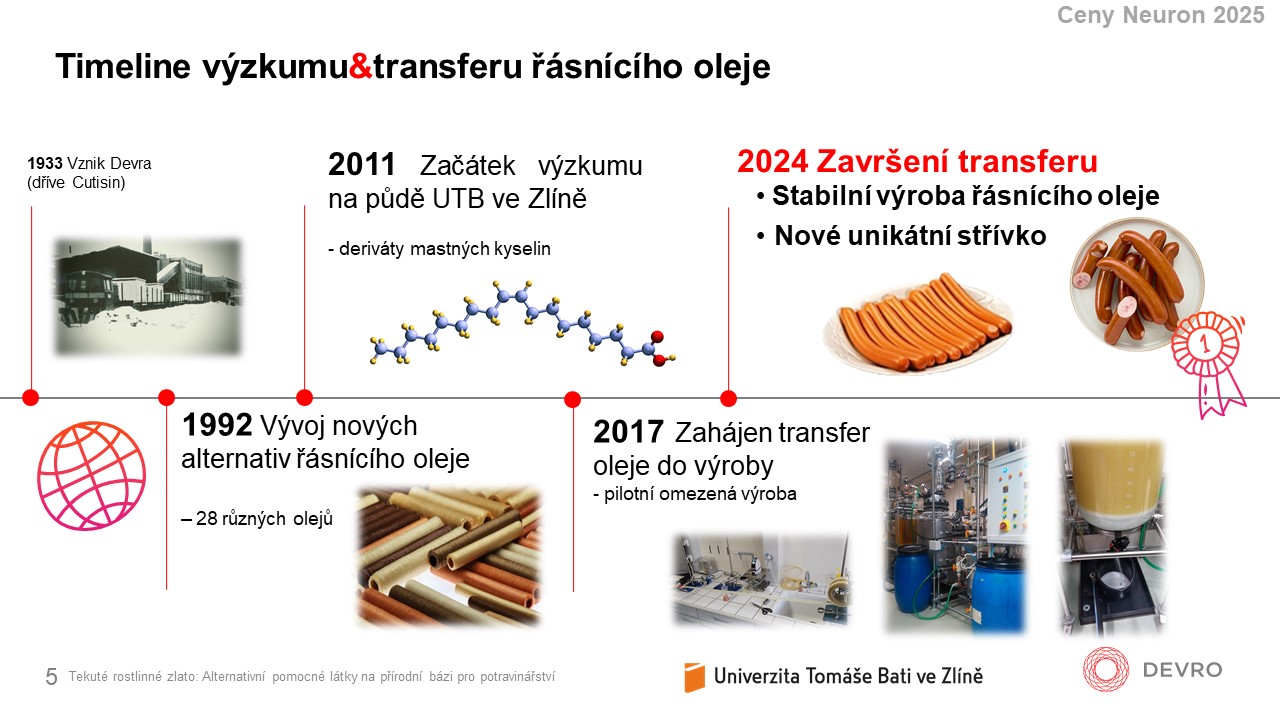 Průlom přinesl až nezávislý výzkum realizovaný na půdě Univerzity Tomáše Bati ve Zlíně. Inovativní řásnicí olej vyvinutý výzkumným týmem univerzity splnil všechny výrobní i legislativní požadavky. Společnost Devro s.r.o. následně v roli investora zajistila náročný proces převodu univerzitního řešení do průmyslové výroby v úzké spolupráci s UTB.